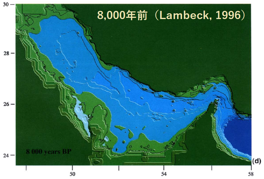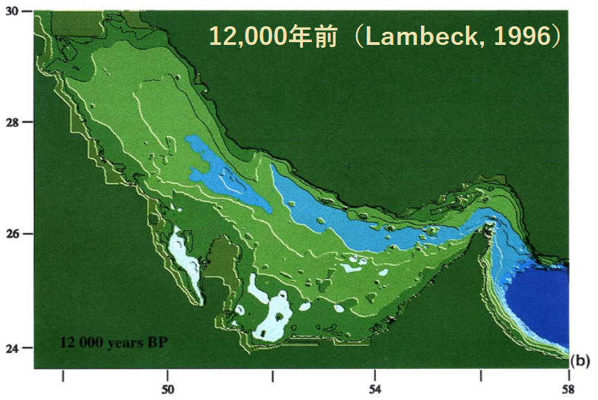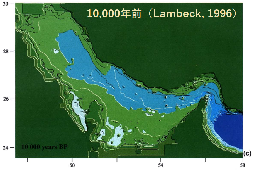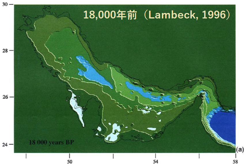 2万4000年前から1万4000年前頃まで1万年もの間、推定海面はホルムズ海峡の海底より低い水準にあり、そのため、オマーン湾の水位がホルムズ海峡の海底より低くなり、ペルシャ湾の海水は川の流れのようにオマーン湾へと流れ出し、湾内には干上がった広大な盆地=ガルフ・オアシス(「ガルフ・オアシス」はローズによる命名)が出現したと考えられる。ガルフ・オアシスは、海跡湖(淡水湖)や盆地の奥から出口に向かう川(ウル・シャット川)や湧き水に潤されて、湿地帯や豊かな植生に覆われた草原や森が広がっていたと考えられる。