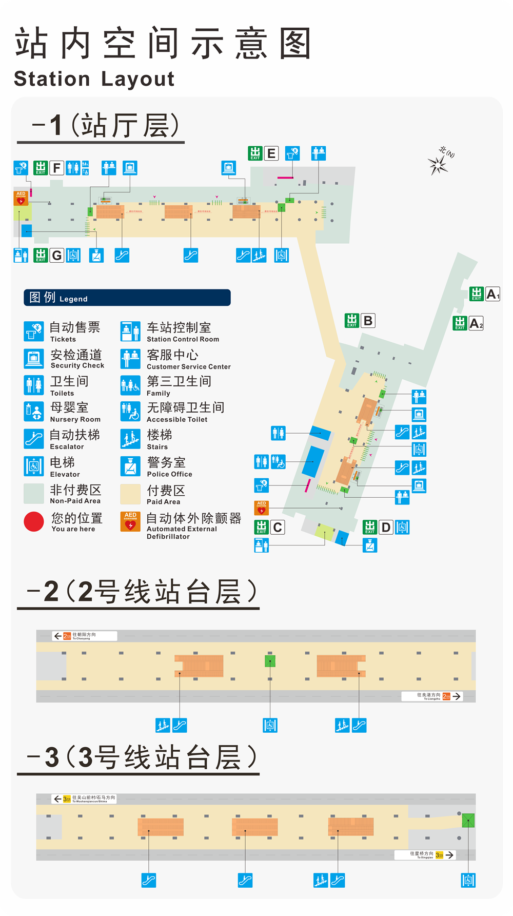 2号線・3号線とも島式ホーム1面2線を有する地下駅である。2号線ホームは環城西路りの、3号線ホームは体育場路りの地下にある。