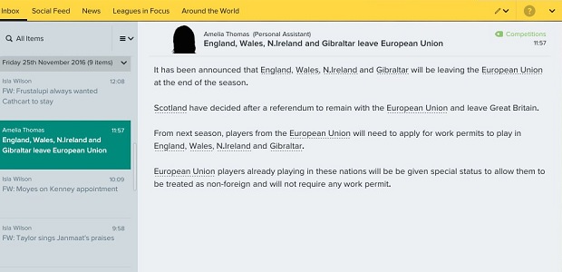 - «Football Manager 2017: Brexit grandfathering». Rock, Paper, Shotgun. 16 de outubro de 2016. Consultado em 9 de outubro de 2024