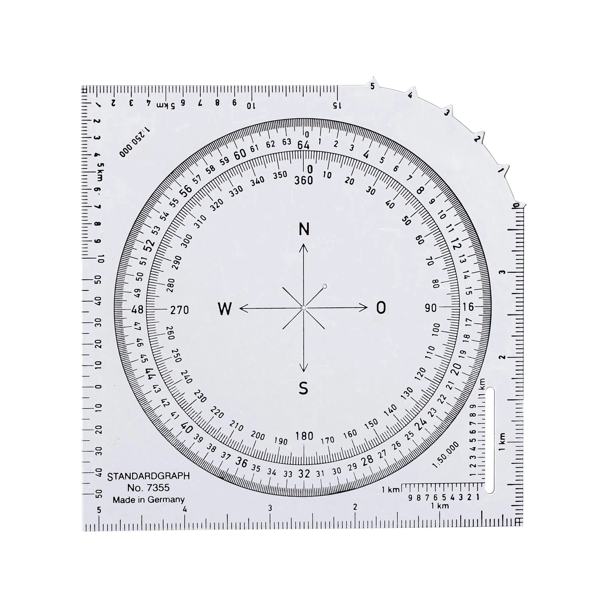 - Масштабна лінійка (нім. Planzeiger, також Конвертор одиниць) — вимірювання розмірів на картах безпосередньо у масштабі карти — у дійсних розмірах на місцевості, тобто метрах, кілометрах або ярдах чи милях за допомогою шкал відповідних масштабів на транспортирі[d]. Є спеціальні масштабні лінійки для вимірювання кута схилу (англ. Scale Slope ruler), які мають градієнтну шкалу (Див. нижче Шкала закладань).