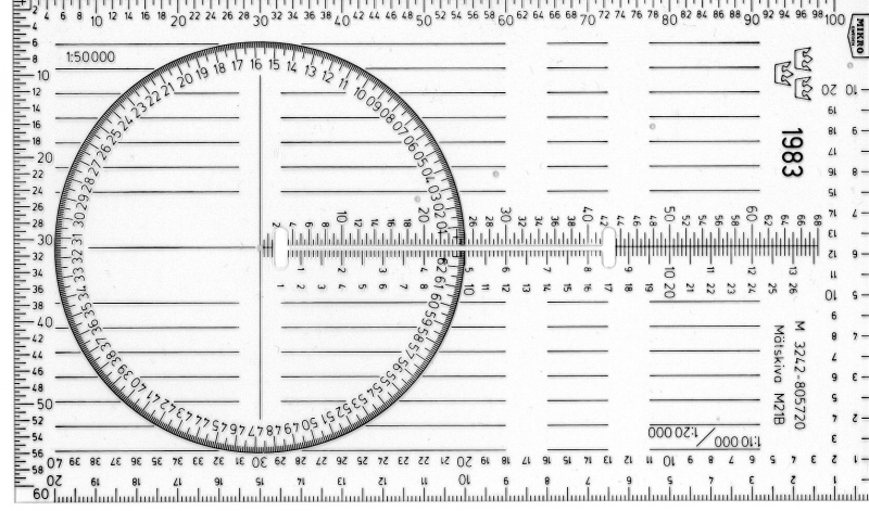 - Масштабна лінійка (англ. Scale ruler, нім. Planzeiger, також Конвертор одиниць) — вимірювання розмірів на картах безпосередньо у масштабі карти — у дійсних розмірах на місцевості, тобто метрах, кілометрах або ярдах чи милях за допомогою шкал відповідних масштабів на транспортирі[f]. Є спеціальні масштабні лінійки для вимірювання кута схилу (англ. Scale Slope ruler), які мають градієнтну шкалу (Див. нижче Шкала закладань).