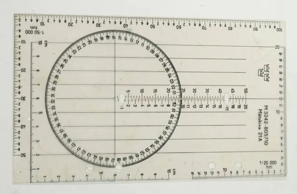 - Масштабна лінійка (англ. Scale ruler, нім. Planzeiger, також Конвертор одиниць) — вимірювання розмірів на картах безпосередньо у масштабі карти — у дійсних розмірах на місцевості, тобто метрах, кілометрах або ярдах чи милях за допомогою шкал відповідних масштабів на транспортирі[f]. Є спеціальні масштабні лінійки для вимірювання кута схилу (англ. Scale Slope ruler), які мають градієнтну шкалу (Див. нижче Шкала закладань).